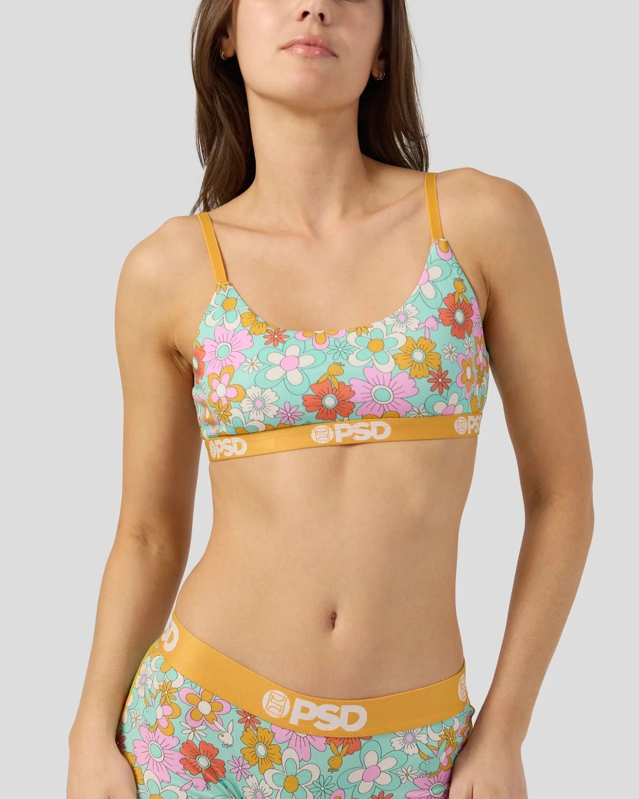 Our latest women’s drop from Playboy x PSD features a groovy ‘60s-inspired print in pretty pastel colors. Made of super soft Modal, the Florid Modal Scoop Bralette almost feels like you're not wearing a bra at all. It’s fully lined and features include adjustable straps, a cute scoop neckline, and a soft microfiber band that won't ride or rub.