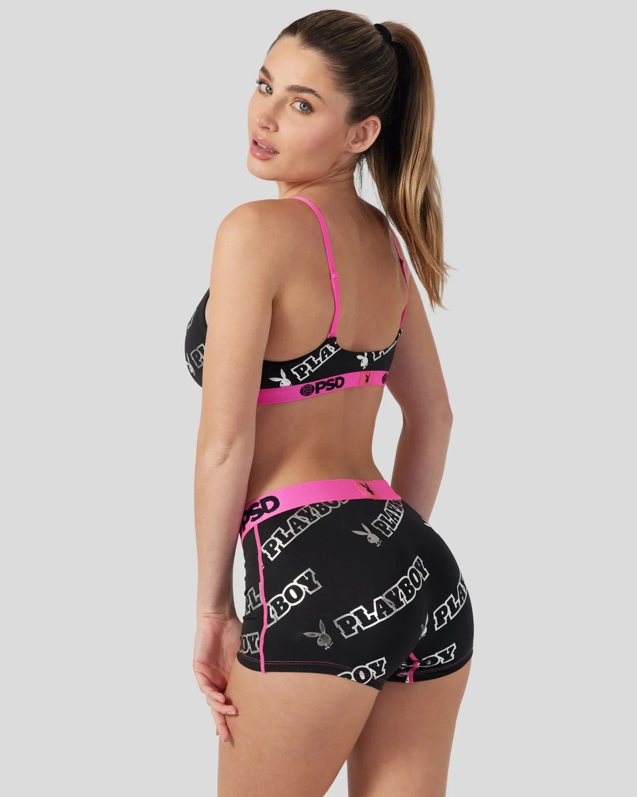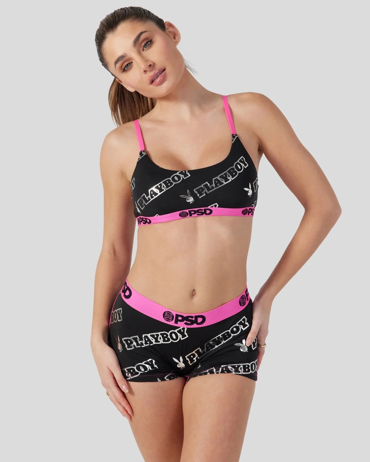 Featuring silver foil lettering and bright pink trim, you’ll definitely stand out in this new drop from Playboy x PSD. Made of our silky poly blend, the Gleam Scoop Bralette almost feels like you're not wearing a bra at all. It’s fully lined and features include adjustable straps, a cute scoop neckline, and a soft microfiber band that won’t ride or rub.